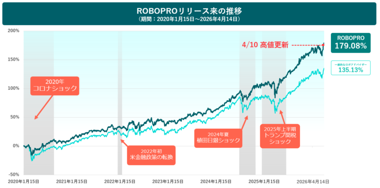 ROBOPROは4月10日に最高値を更新し、サービス開始を開始した2020年1月15日から2026年4月14日までの約6年3か月のパフォーマンスは+179.08%となりました。