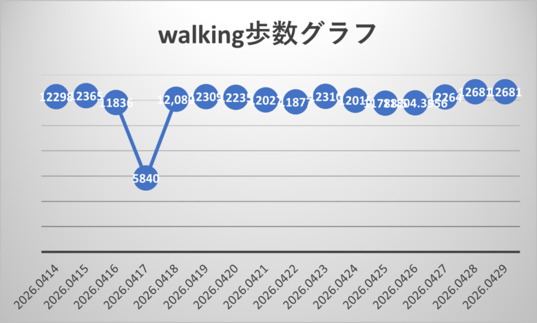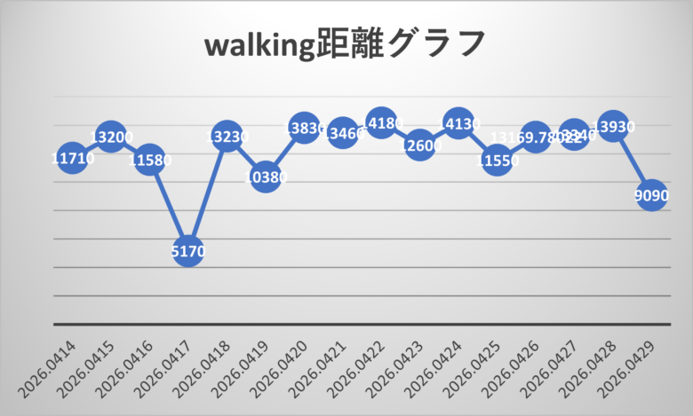 4/12~4/29日の期間の歩数とウォーキング距離です。