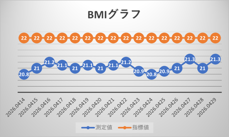BMIの理想値が22に対し、20.8~21.2であり、ほぼ理想値であり